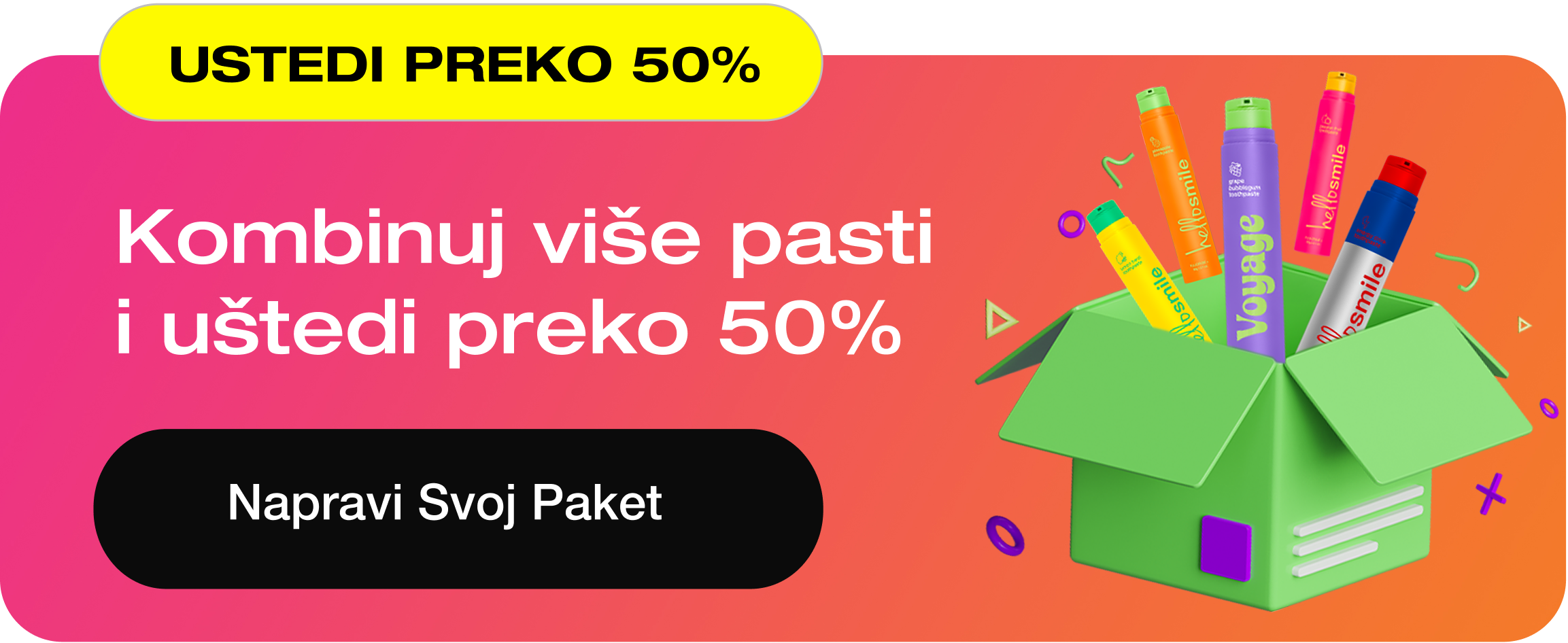 Ako želiš brzo uklanjanje površinskih mrlja (kafe, vina, duvana), idealan je Aktivni Ugalj. Za momentalno osveženje i optičko izbeljivanje pred izlazak, uzmi Ljubičasti Serum. PRO set kombinuje LED lampu i specijalni gel za dugotrajnije i intenzivnije kućno beljenje. Trakice su jednostavan “sve-u-jednom” tretman za svakodnevnu upotrebu, a Olovka je najbrža opcija kada žuriš, naneseš gel i za par minuta vidiš razliku. Za svakodnevnu higijenu i osmeh bogat ukusima, tu su naše Paste (lubenica, mango, mint, kivi, ananas, marakuja, limun, cola, energetsko piće, gume bombone, čokolada, zelena jabuka, jagoda).